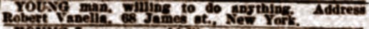 Born and raised in a district ruled by river pirates and street walkers, Vanella was born in a bleak tenement at 68 James Street, giving him virtually no other options but a life of crime.  In 1899, the sixteen year old Vanella proved his desperation by posting a classified ad in the New York Herald, which stated: