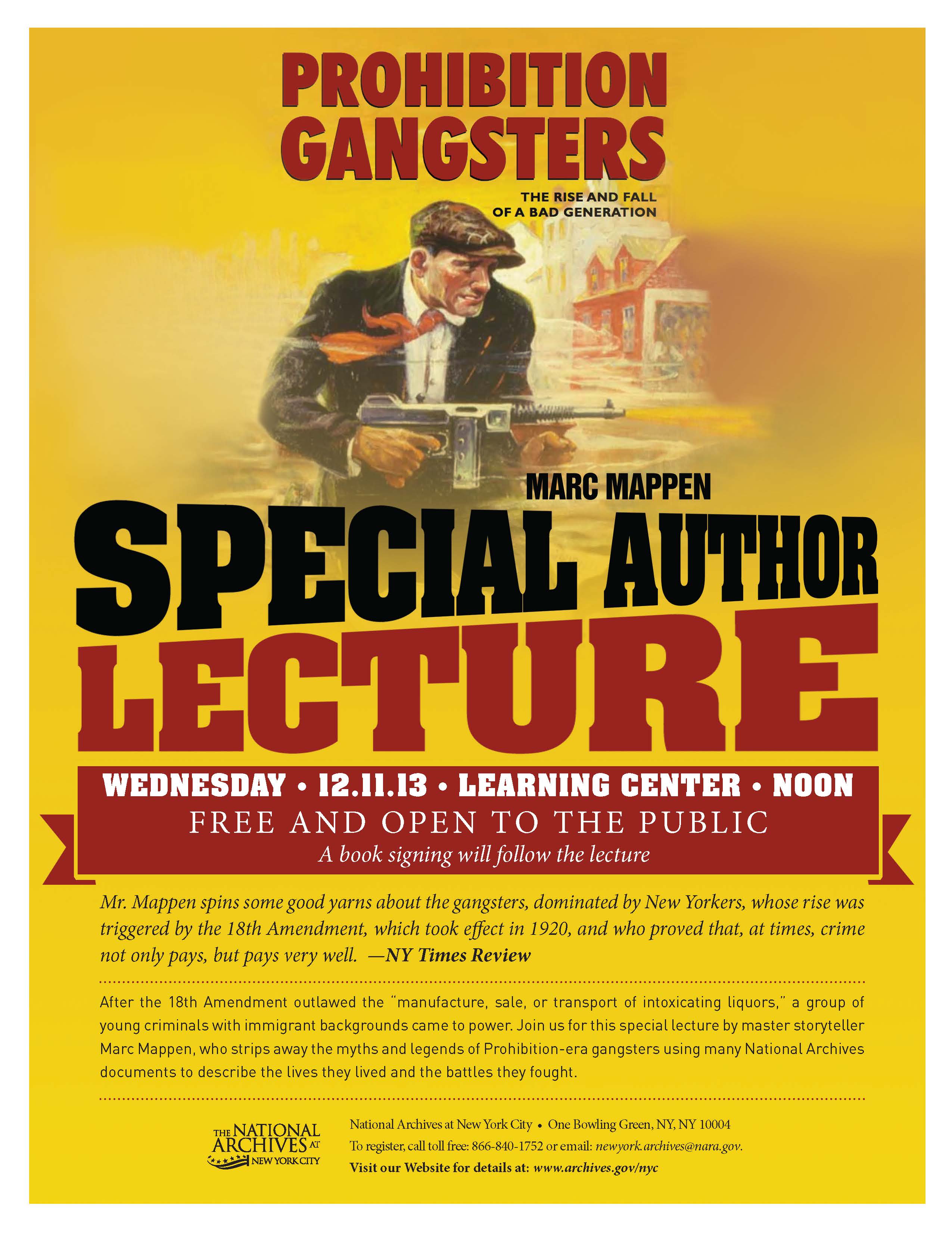 A rescheduled lecture will be held at the National Archives at New York City tomorrow, Wednesday December 11, at 12pm. “Prohibition Gangsters: The Rise and Fall of a Bad Generation” highlights many documents found within the holdings of the National Archives to describe the lives these gangsters lived and the battles they fought.